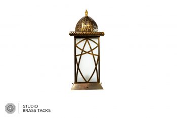 A dome with pierced openings sits on a rectangular body. Frosted glass on the four sides of the body is caged with an ornate Arabic design giving it a stunning effect.